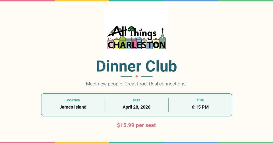 The ATC Dinner Club is coming up soon! Tuesday, April 28 at 6:15 PM on James Island. Take a short personality quiz, we match you with 5 other locals who share your vibe, and everyone sits down for dinner at a hand-picked Charleston restaurant. We handle the booking, the matching, and all the details. The restaurant gets revealed the morning of, and after dinner there's a second spot where I'll be hanging out and meeting everyone in person. Seats are $15.99 and going fast. If you've been on the fence, this is the week to lock it in. Grab your spot here.